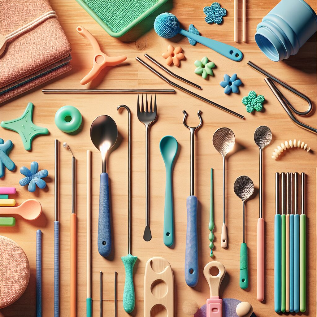 Bl.a. inkluderer sortimentet hjælpemidler som ARK Lip Blok, Z-Vibe, bidesmykker og bidetings, som alle har specifikke anvendelser i mundmotorisk træning. ARK Lip Blok bruges til at forhindre tungestød ved at træne tungepositionen, hvilket gør det lettere at drikke sikkert gennem sugerør. Z-Vibe er et vibrationsredskab, der stimulerer læber, tunge og kæbe, hvilket understøtter både taleudvikling og tyggeevne. Bidesmykker og bidetings fungerer som oralt stimulerende redskaber, der kan berolige nervesystemet, reducere stress og øge koncentrationen. Disse produkter fås i forskellige hårdheder og former, så de passer til individuelle behov.